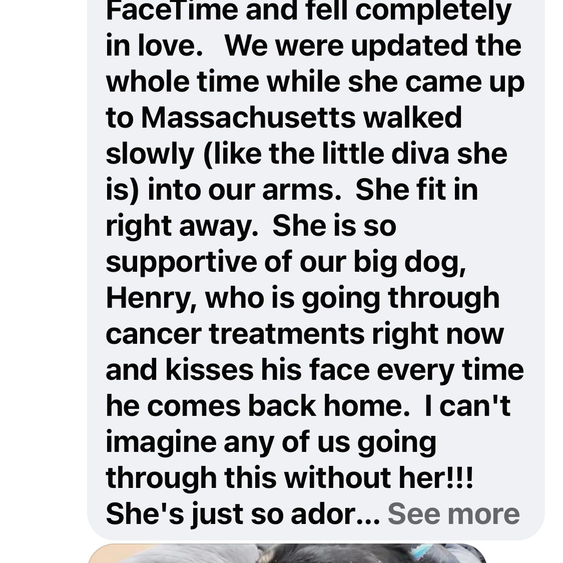 We are located in Houston, TX, normally our dogs travel to foster homes in the MA and CT area before going to their forever homes, but because of the demand in the adoptions this year our dogs are traveling in foster to adopt now, this means our dogs travel directly to adopters who pick them up from transport in East Hartford CT when they leave their Texas fosters. Our dogs travel in Professional pet transport to the arms of their loving prospective adopters. After the dog arrives we usually wait 2 to 3 weeks before we finalize the adoption. We want to make sure the dog is happy and the new family is too!