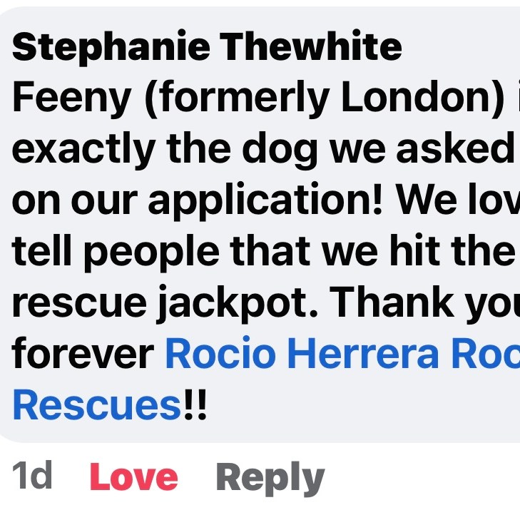 Rocio’s Rescues works very hard to make perfect matches between families and rescue dogs and cats. Filling an application is the first step in that process followed by a phone call and a Facetime call with the dog or cat and the adopters.